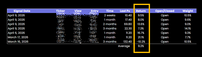 New Signals: Two of the four ideas below carry a 90% historical probability of positive returns, with average gains of 20–25% in under a month. Our systematic framework continuously scans the data, matching current setups against historical patterns to surface exactly these opportunities. The odds are compelling. Here's what they look like.